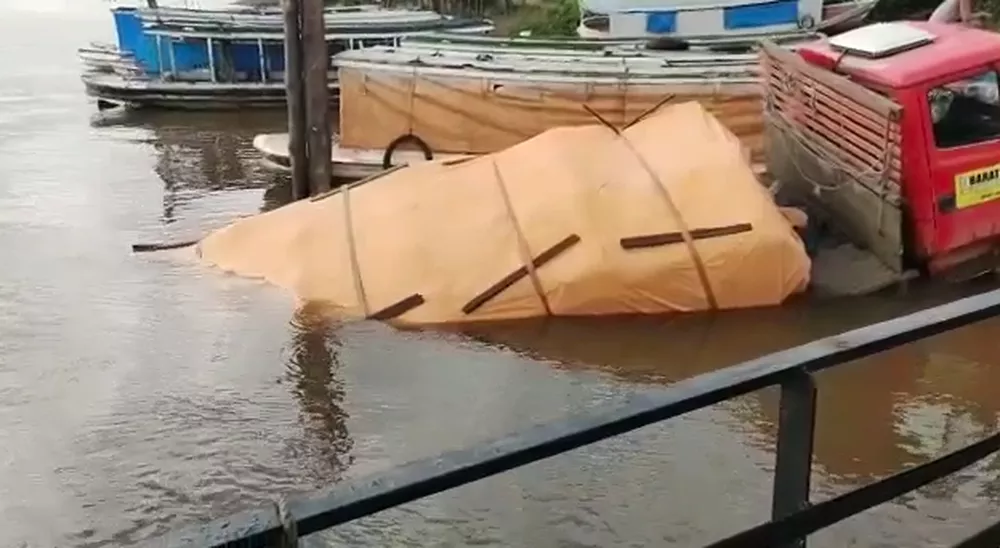 O veículo saiu da balsa, mas quando a embarcação foi embora, o caminhão derrapou e foi parar no Rio Amazonas. Não houve feridos.